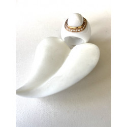 Cette bague de la collection Tango est conçue en ton sur ton. La résine est blanche. Le cabochon pain de sucre est une opale blanche, ou cacholong, et l'entourage de diamants est serti sur or rose. Pureté absolue des lignes et confort optimal pour ces bagues de la collection Tango. Les poinçons sont apposés su le coté extérieur de la bague.